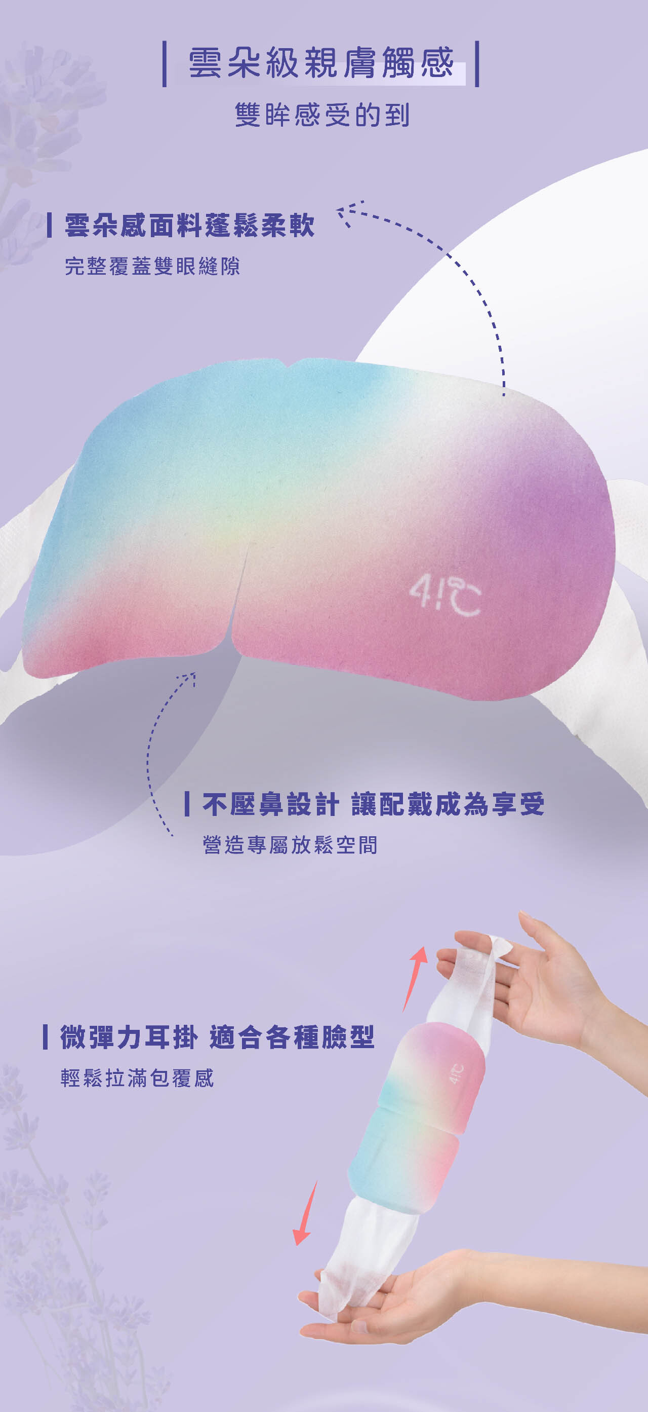 • 從包裝袋內取出眼罩,從切口線撕開掛上雙耳掛。
