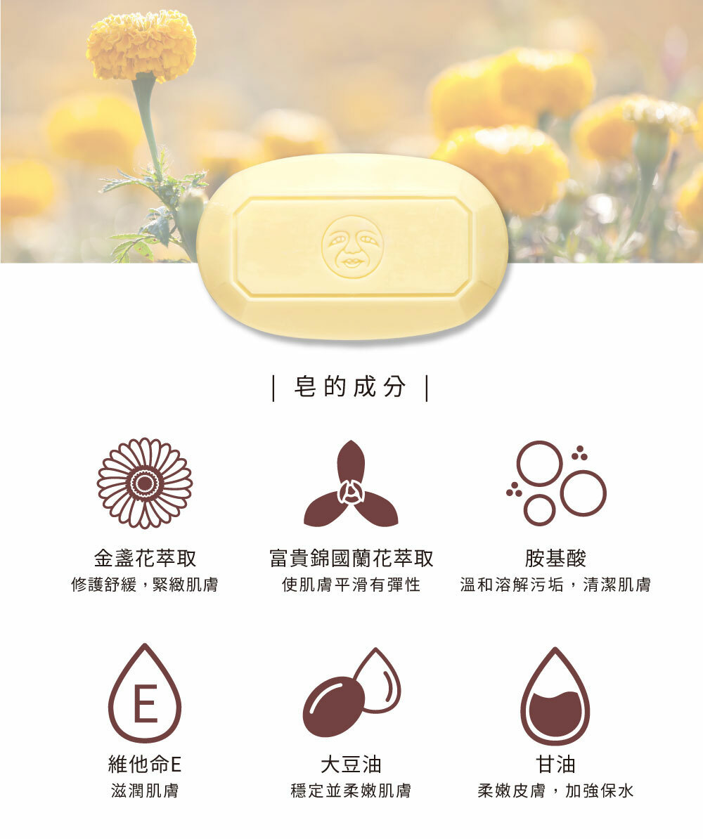 成分:棕櫚油、棕櫚核仁油、乳霜、甘油、大豆油、金盞花萃取、富貴錦國蘭花萃取、洋甘菊萃取、胺基酸、維他命E