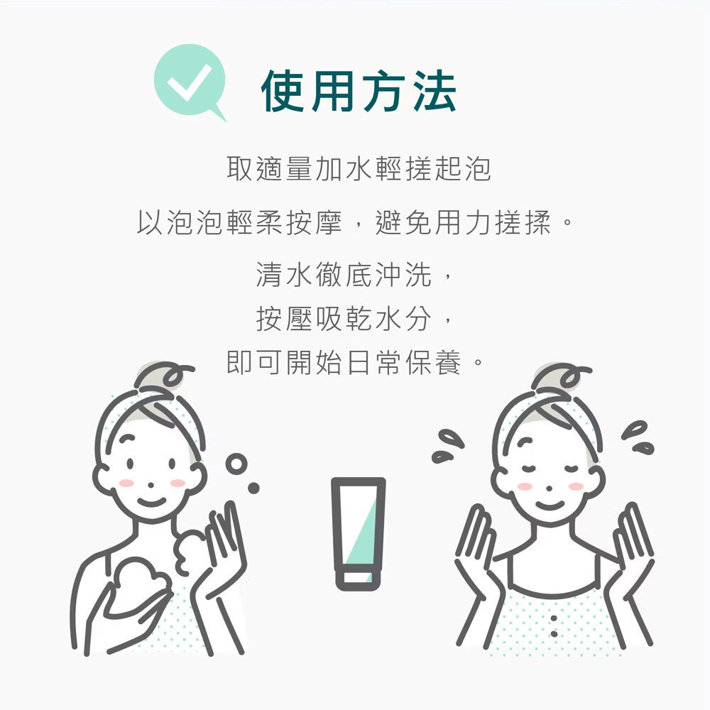 使用方法: 濕臉後,取適量於掌心以水混和搓至起泡,均勻塗抹於臉部及頸部,再以清水洗淨即可。