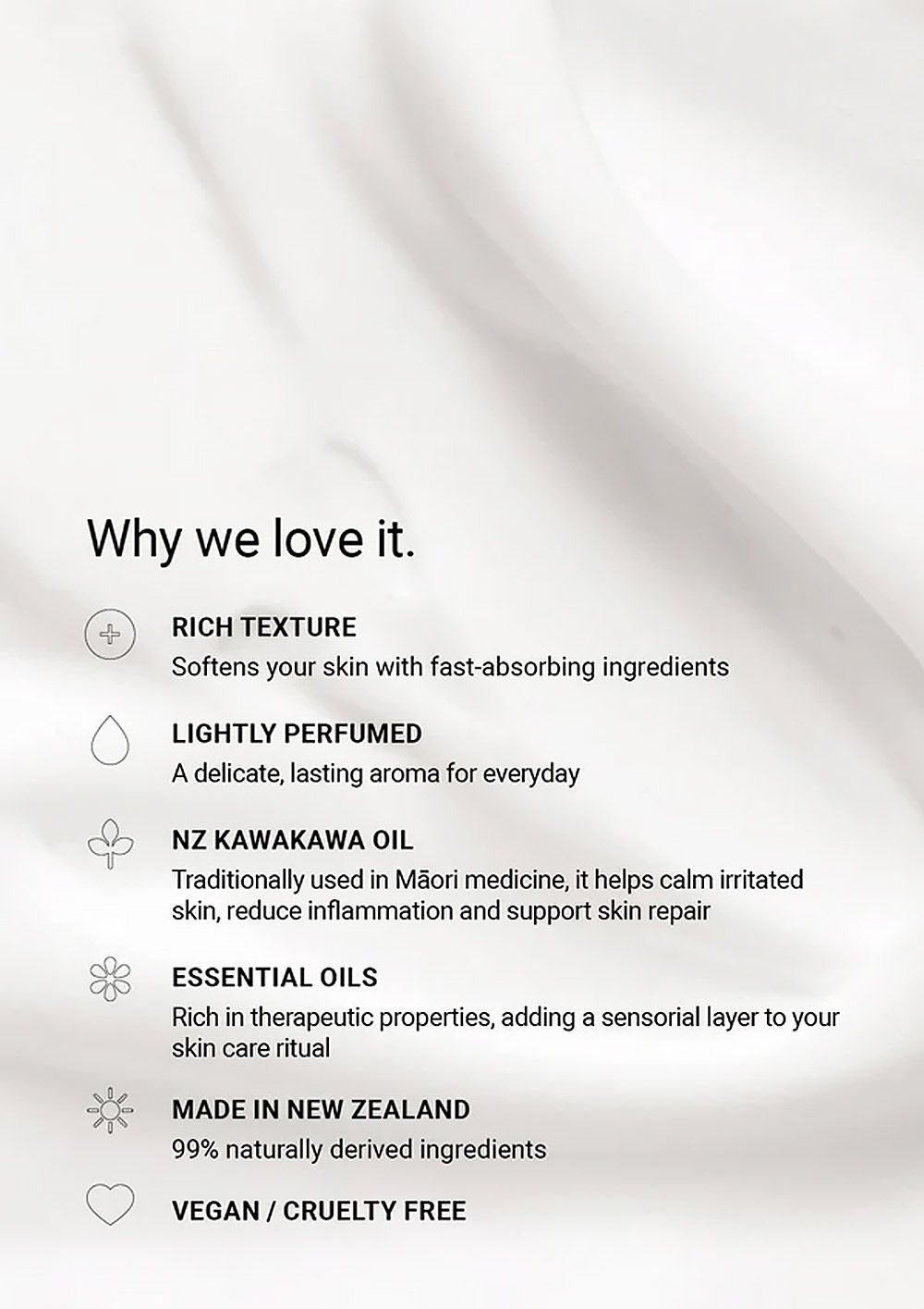 本產品蘊含:芒果籽油 -豐盈肌膚,幫助減少細紋和皺紋;酪梨油-富含維生素E;椰子油-富含抗氧化劑和維生素A;紐西蘭特有卡瓦卡瓦油和精油。
