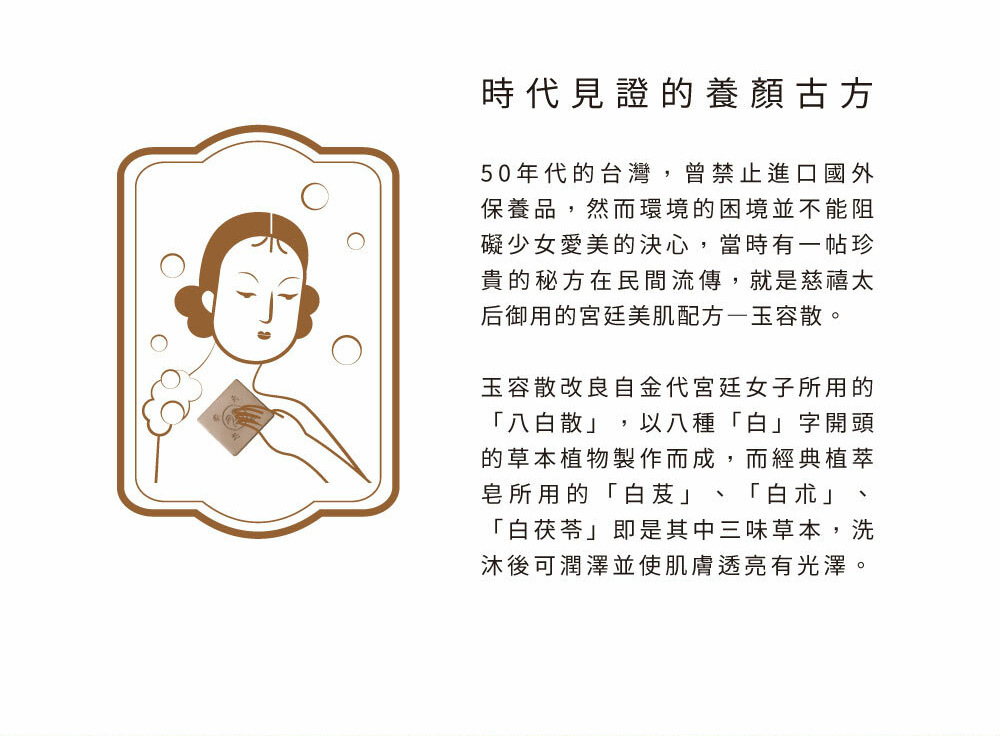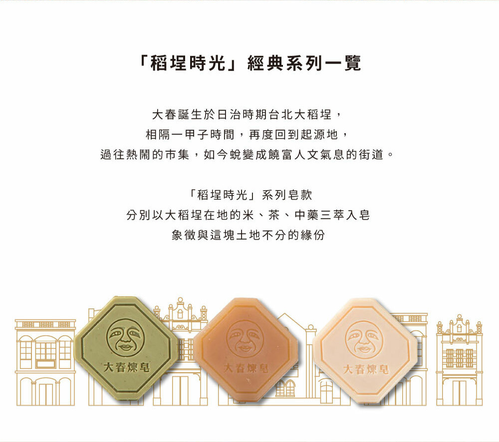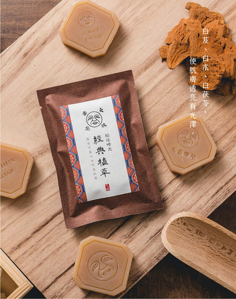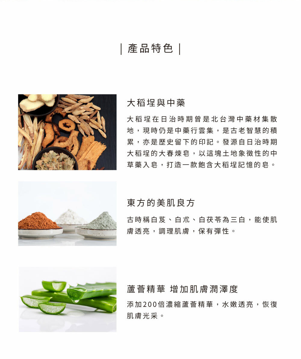 * 以大稻埕在地材料入皂,添加草本漢方三白:白茯苓、白朮、白芨與蘆薈精華調和成美肌良方,讓肌膚白皙透亮
