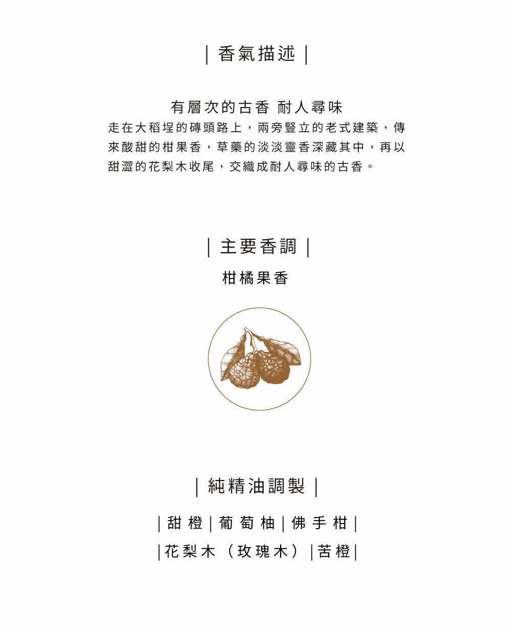 * 柑橘系與木質調精油,調和中草藥的幽香