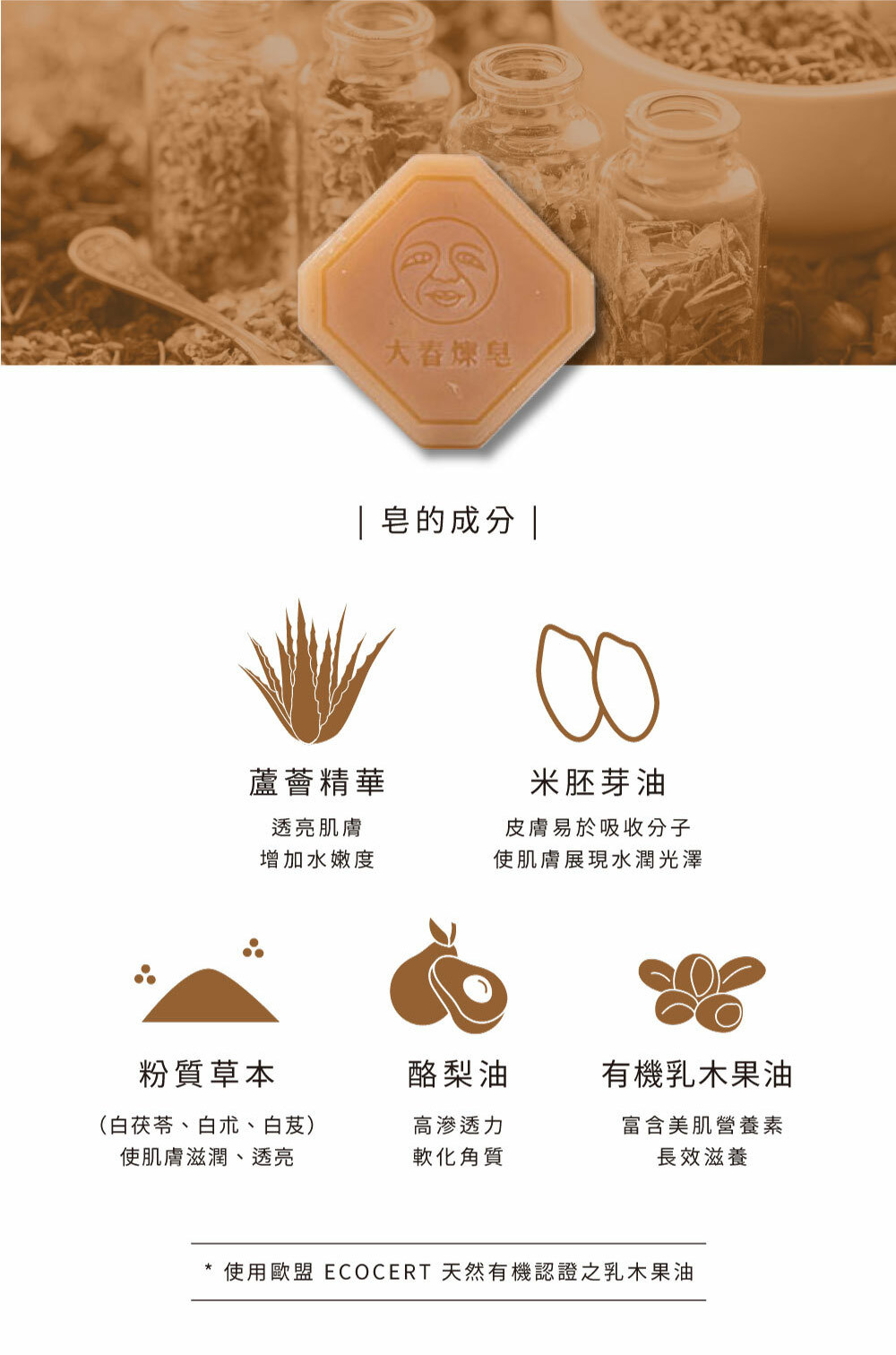 成分:棕櫚油、棕櫚核仁油、中藥粉(白茯苓、白朮、白芨)、米胚芽油、有機乳木果油、酪梨油、佛手柑精油、苦橙精油、甜橙精油、花梨木精油、葡萄柚精油、蘆薈精華