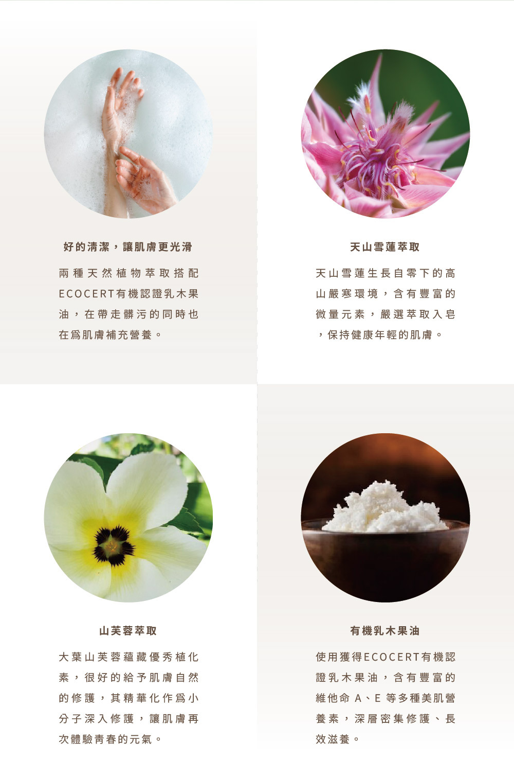 成分:棕櫚油、棕櫚核仁油、甘油、有機乳木果油、天山雪蓮萃取、山芙蓉萃取