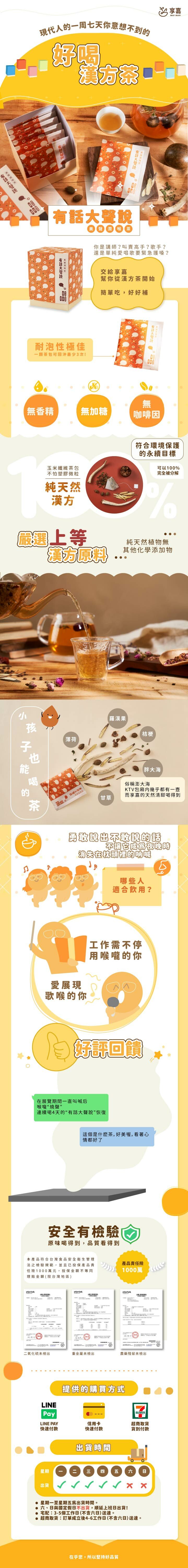 七天漢方茶系列,為了延續傳統文化和產業創新,從包裝設計到口味都有別於傳統漢方茶,採用純天然植物,無任何添加劑,以及玉米纖維茶包,達到自然資源的永續管理。