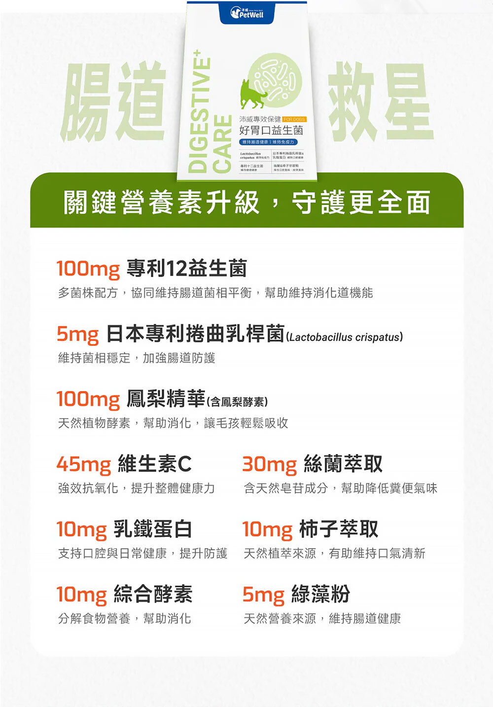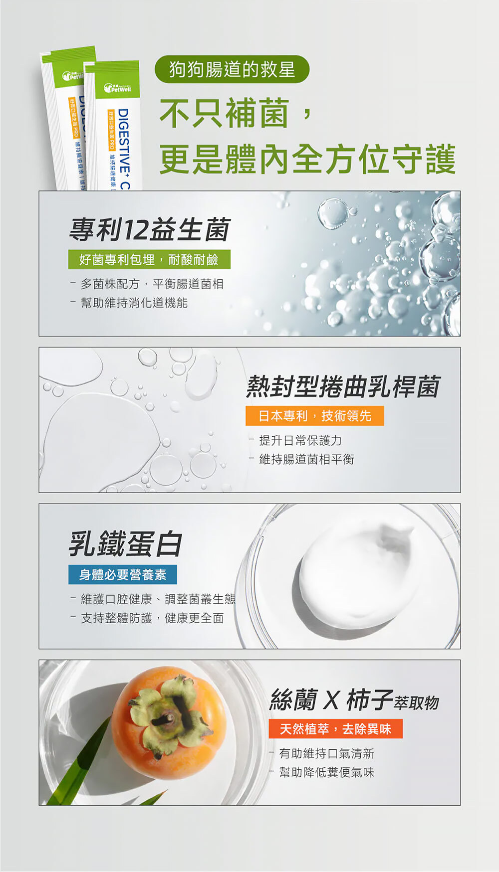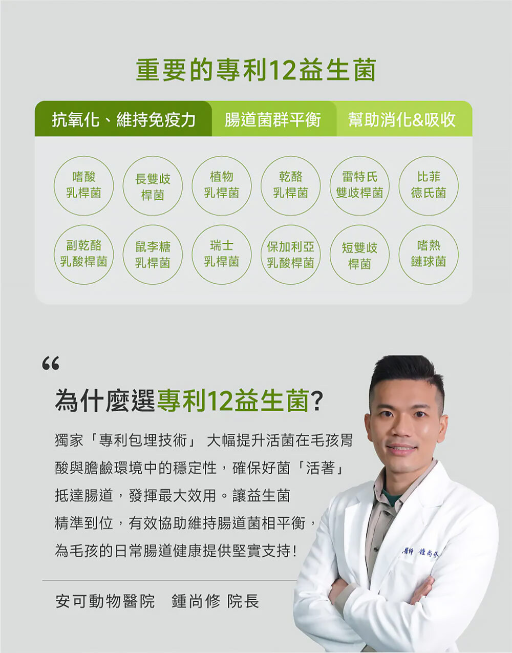 🐶專利12益生菌 + 捲曲乳桿菌: 嚴選多元專利菌株,協同捲曲乳桿菌,建立優勢菌叢,維持腸道健康平衡。