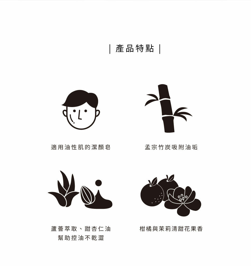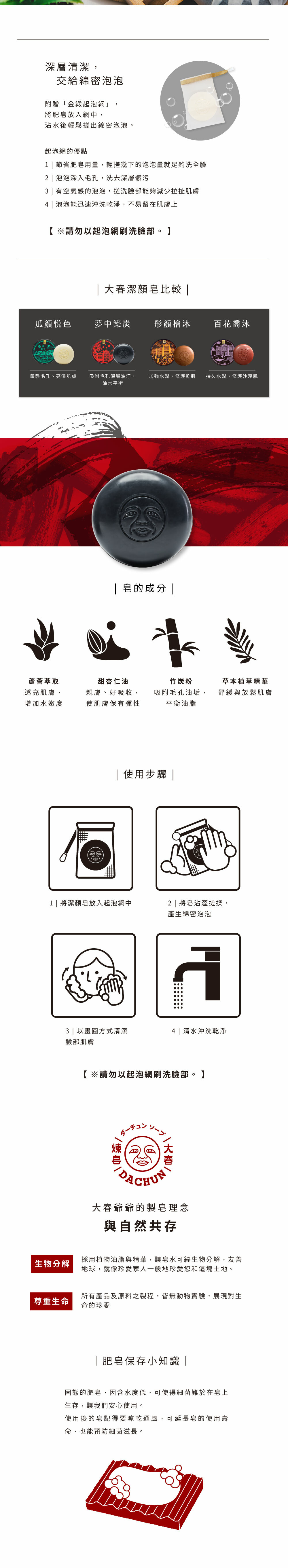 成分:棕櫚油、棕櫚核仁油、竹炭粉、酪梨油、甜杏仁油、草本植萃精華、蘆薈萃取