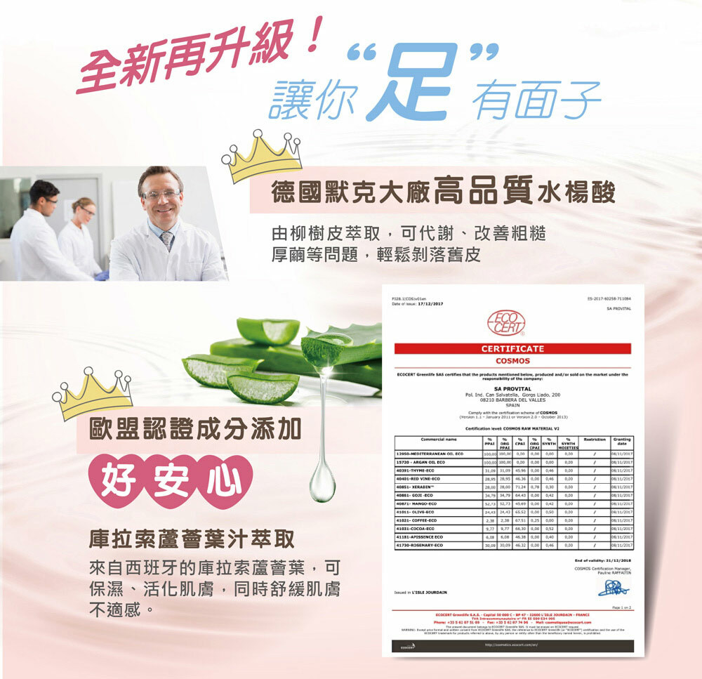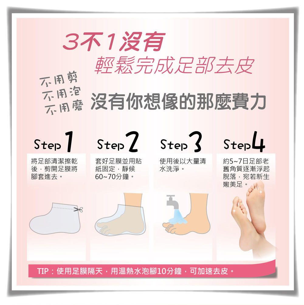 5. 本商品含有酸類成分,腳部有傷口、濕疹、皮膚炎、嚴重腳氣、孕婦、哺乳期、蠶豆症、糖尿病患者和孩童請勿使用。使用後需塗抹防曬劑、一星期內避免腳部曝曬陽光、不要穿夾腳托、穿著襪子保護雙腳。