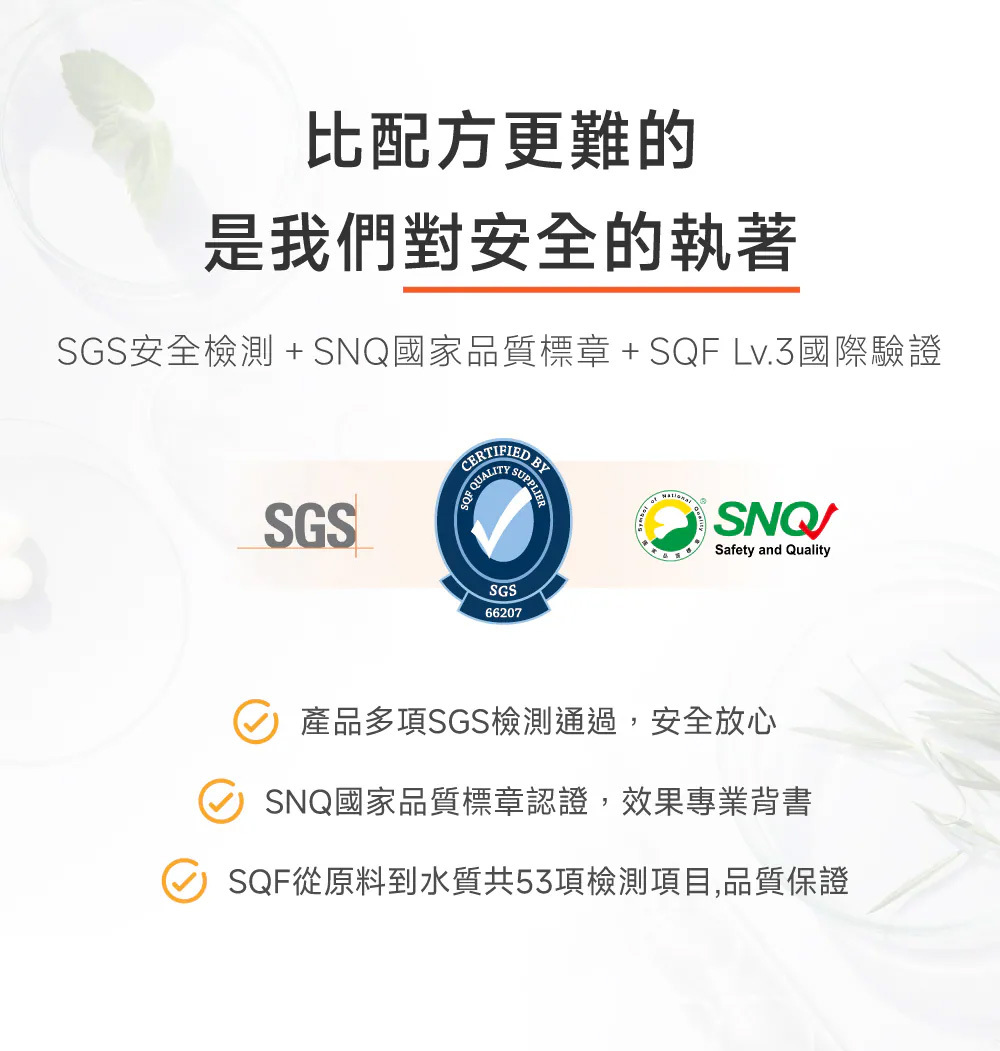 🧡頂級雙認證榮耀: 榮獲 SNQ國家品質標章肯定,並由國際SQF Level 3 最高等級驗證工廠生產,食安標準業界頂尖。