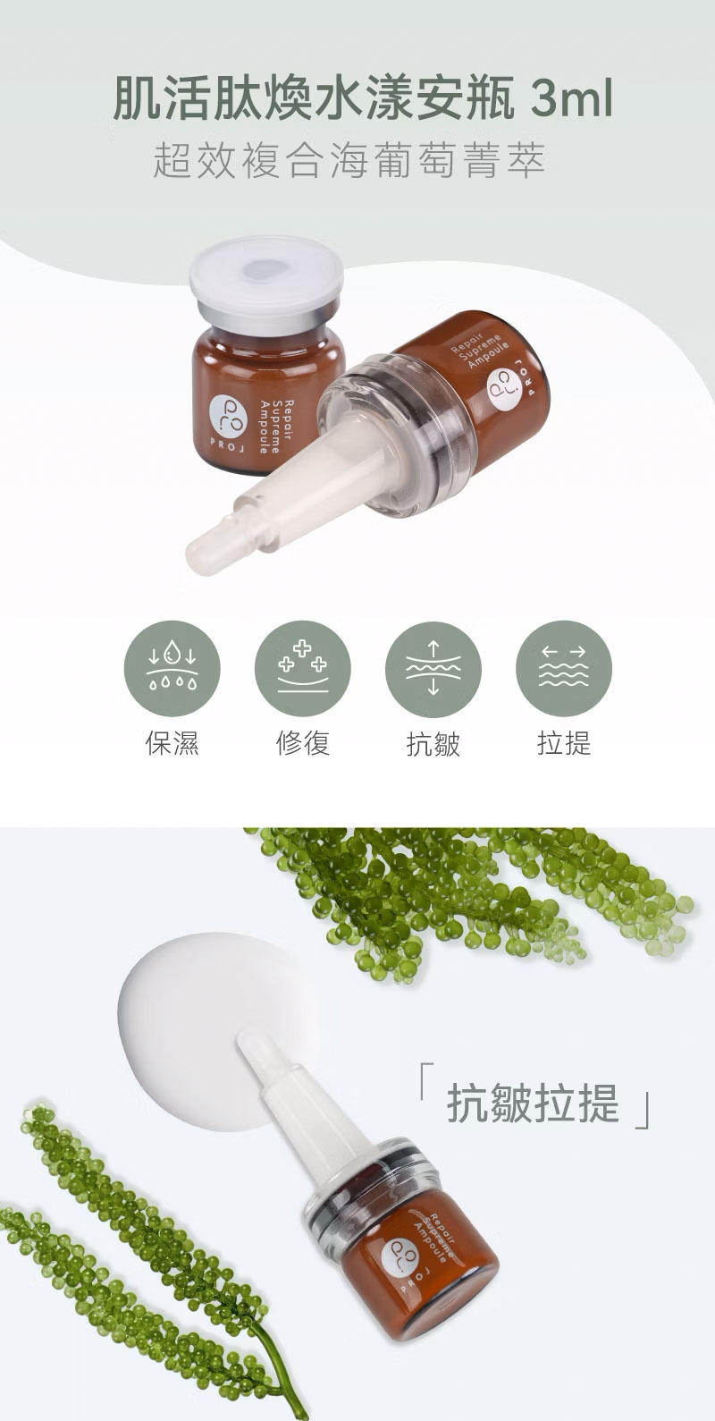 海葡萄萃取液、海岸松樹皮萃取、三胜肽、六胜肽、海茴香萃取、桃樹脂萃取液、細胞能量飲