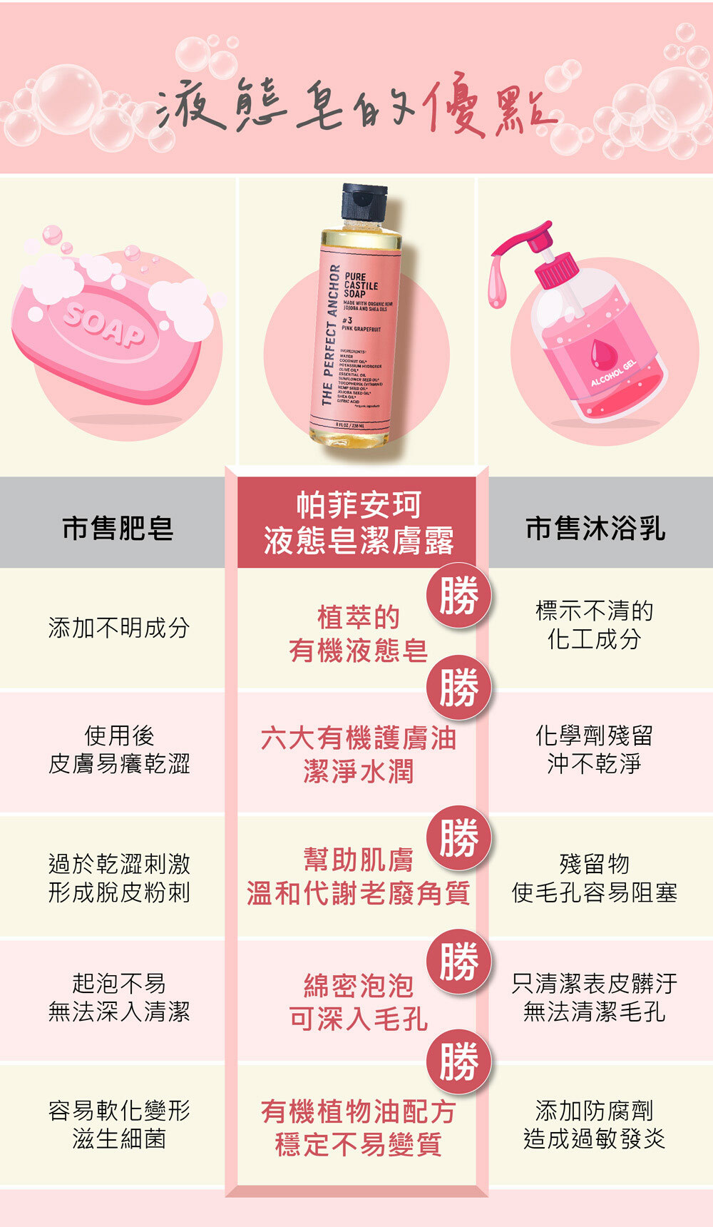 1.帕菲安珂全系列產品皆為無添加的液態皂產品,且不含不流淚配方,請小心避開眼睛使用,若不慎接觸到眼睛,請用清水沖洗。