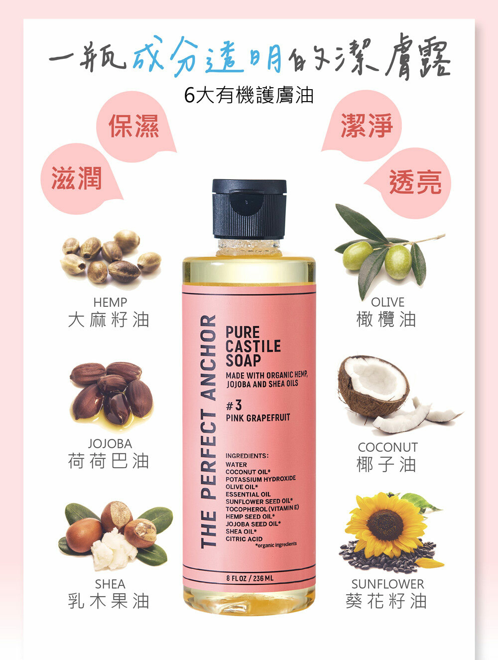 《全成份》Water, Cocos Nucifera Oil, Potassium Hydroxide, Olea Europaea Fruit Oil, Pink grapefruit oil, Helianthus Annuus Seed Oil, Tocopherol, Cannabis Sativa Seed Oil, Simmondsia Chinensis Seed Oil, Butyrospermum Parkii (Shea) Oil, Citric Acid.