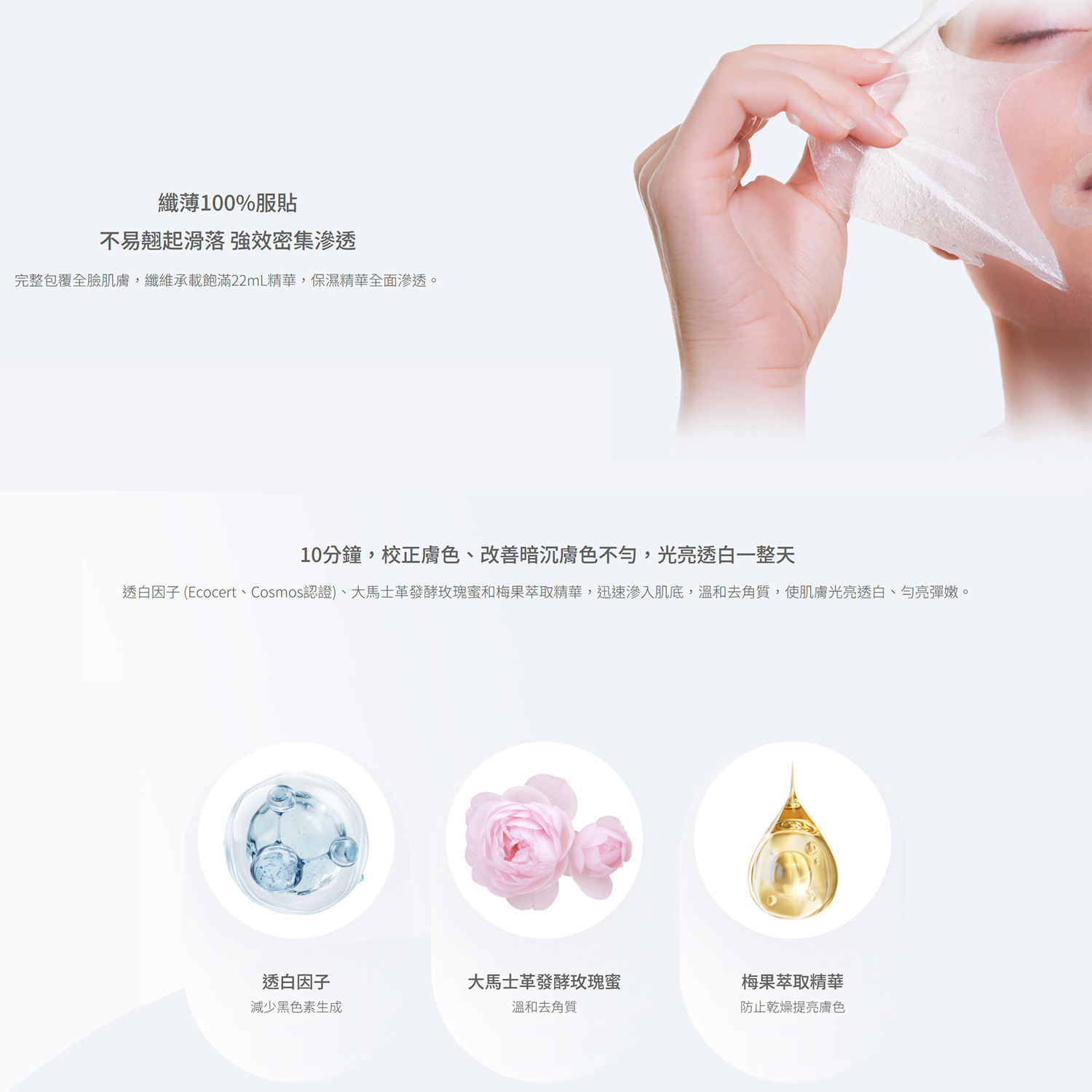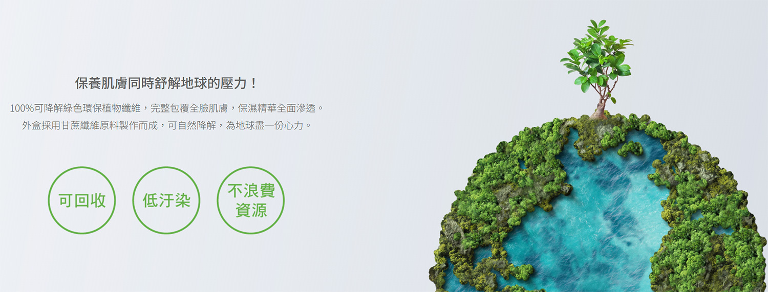 100%可降解綠色環保植物纖維,完整包覆全臉肌膚,纖維承載飽滿22mL精華,保濕精華全面滲透。