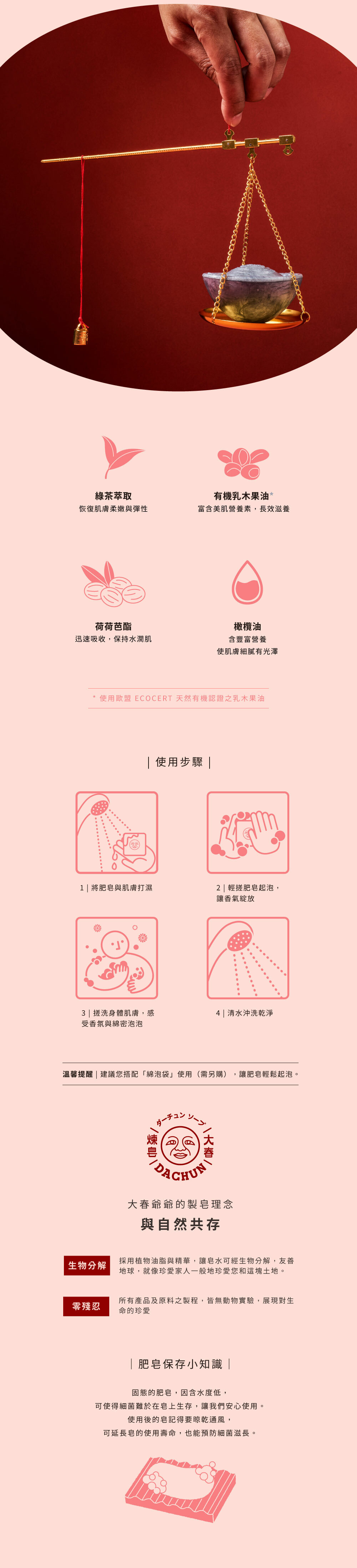 成分:棕櫚油、棕櫚核仁油、甘油、荷荷芭酯、橄欖油、有機乳木果油、綠茶萃取