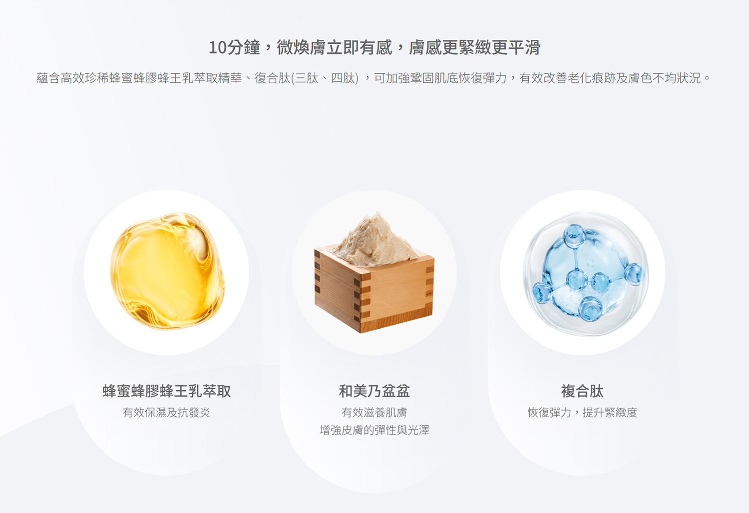 全成分:‧蜂萃修護精華: 蜂膠、蜂蜜、蜂王乳三元萃取,豐潤緊緻 ‧雙胜肽精華: 熨撫皺紋,修復肌膚 Water, 1,2-Hexanediol, Xanthan Gum, Niacinamide, Hydroxyacetophenone, Allantoin, Chlorphenesin, Carbomer, Butylene Glycol, Hydrolyzed Adansonia Digitata Extract, Molasses, Sea Water, Glycerin, Saccharide Isomerate, Disodium EDTA, Potassium Hydroxide, Honey Extract, Coco-Glucoside, Royal Jelly Extract, Honey, Oryza Sativa (Rice) Lees Extract, Propolis Extract, Phenoxyethanol, Citric Acid, Sodium Citrate, Caulerpa Lentillifera Extract, Polysorbate 20, Benzyl Alcohol, Potassium Sorbate, Cucurbita Pepo (Pumpkin) Seed Extract, Palmitoyl Tripeptide-1, Palmitoyl Tetrapeptide-7