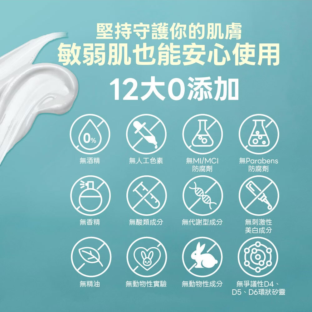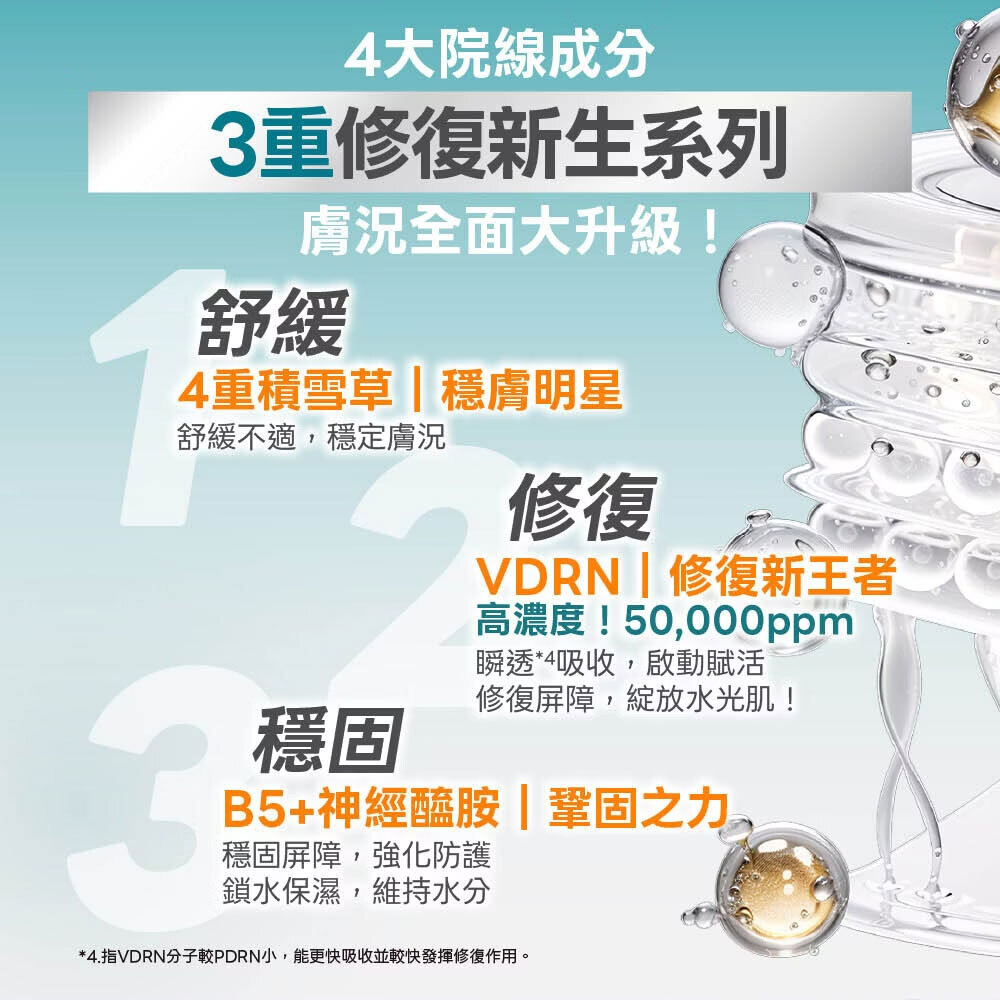 VDRN B5修復新生系列成分溫和,無添加酒精、香精、Parabens防腐劑...等12大刺激性成分,適合各年齡層、各類膚質、敏弱肌均可使用。