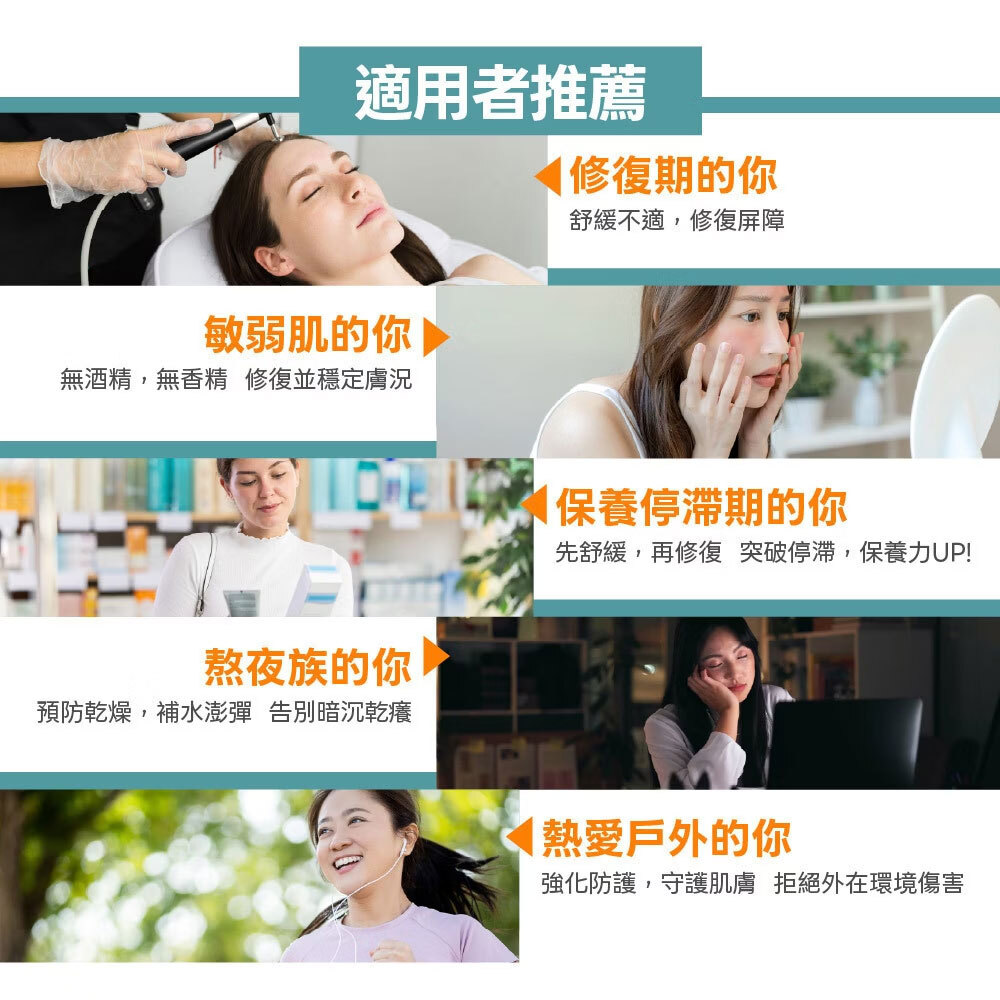 都適合使用。清潔、保養等方式是人為可控的,但環境變化、汙染、曝曬卻是不可控的,也就是肌膚仍有持續受損的可能,為了維持健康肌膚,建議長期使用;若有緊急膚況時,也能用來加強舒緩修復。