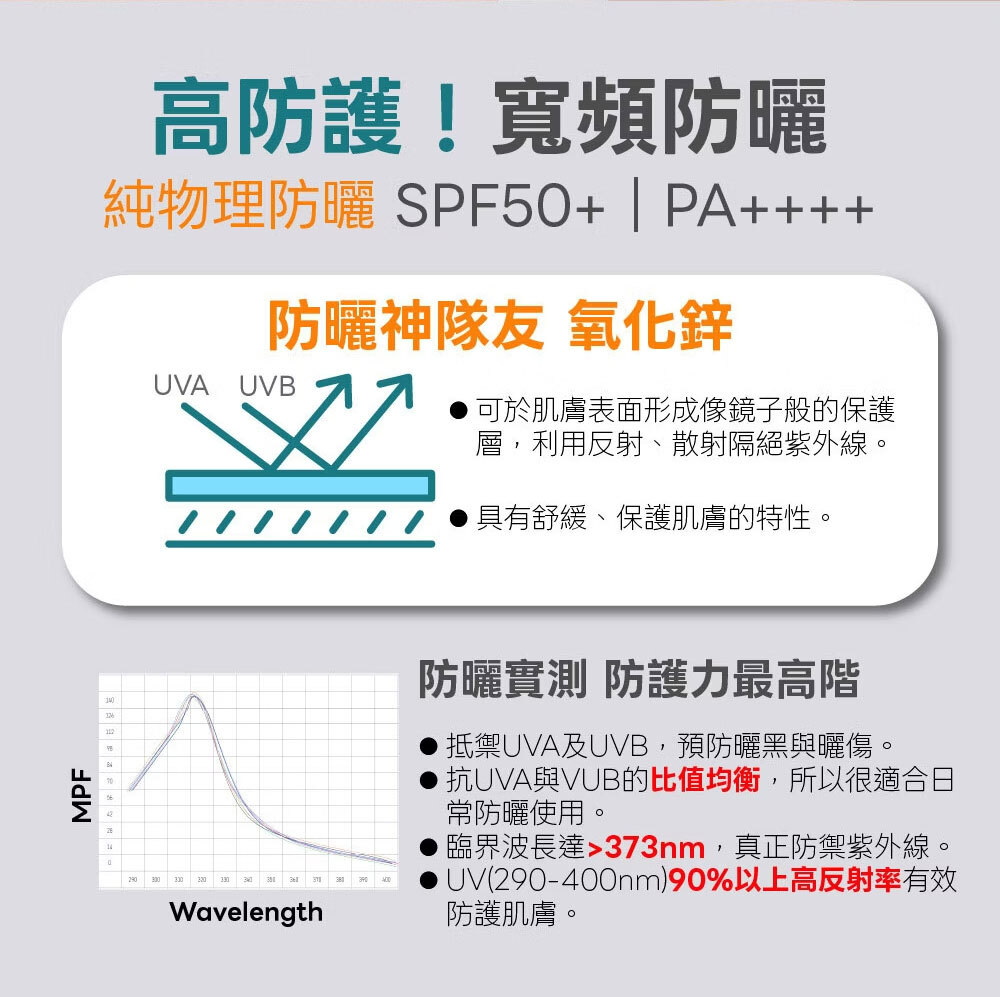 ■ 純物理防曬成分-氧化鋅,溫和對抗UVA、UVB