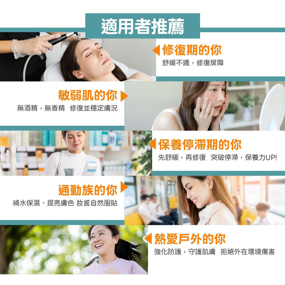 成分溫和,無添加酒精、香精、Parabens防腐劑...等12大刺激性成分,適合各年齡層(6歲+)、各類膚質、敏弱肌均可使用。