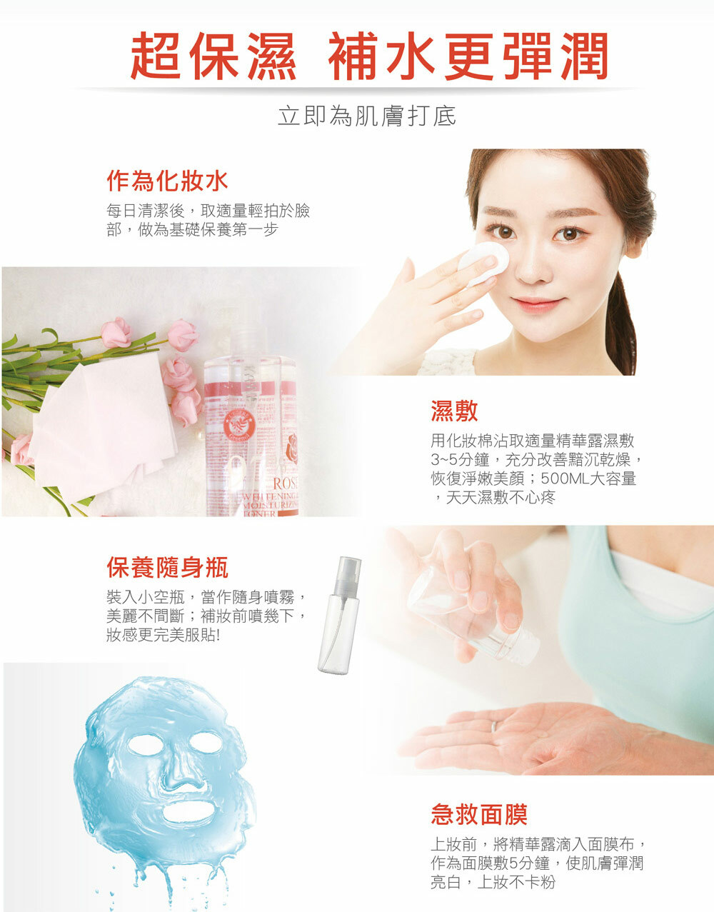 使用方法:清潔完臉部後,用化妝棉沾取適量保濕精華露,從T字位開始輕拍,直到精華露完全被肌膚吸收為止。 ※建議每周全臉濕敷2~3次,打造白皙淨嫩美顏肌。