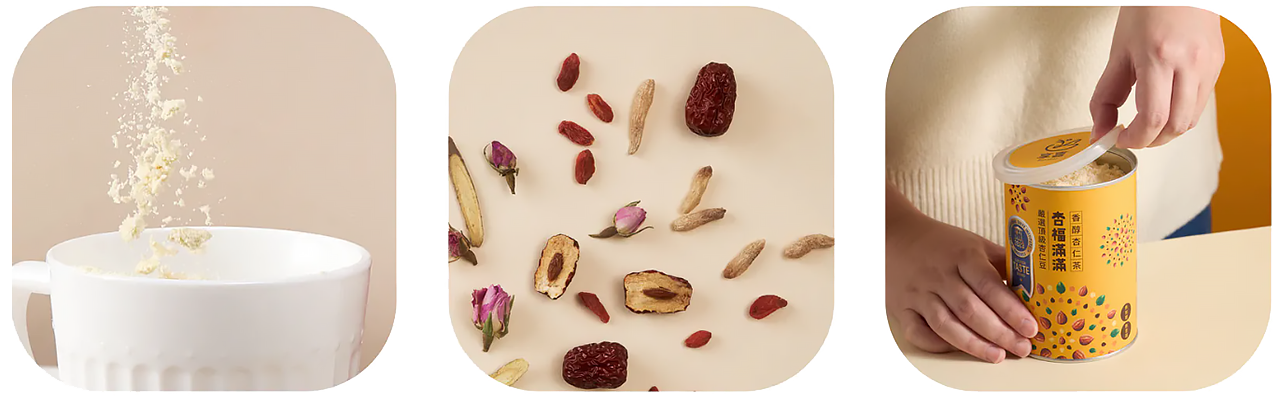 我們的杏福滿滿 杏仁茶系列參氣滿滿 花旗參系列以及七天漢方茶系列,擁有以下三大特點: