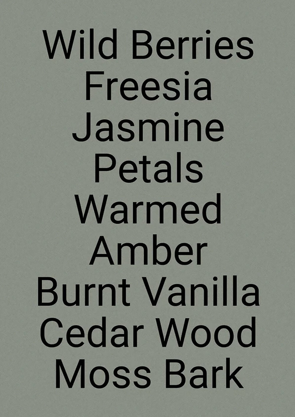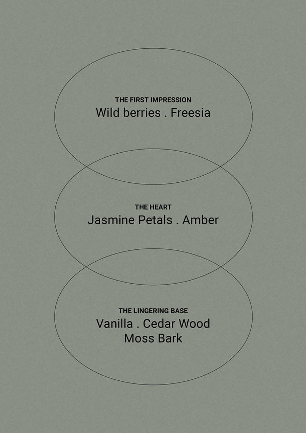 前調是濃鬱的野生漿果、盛開的小蒼蘭和茉莉,清新明亮,與溫暖的琥珀香調形成鮮明對比。