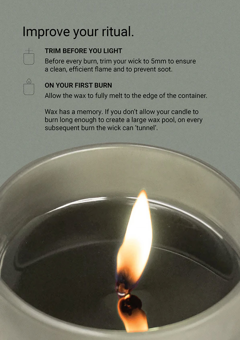 為了充分發揮蠟燭的功效,每次使用前,請將燭芯修剪至5毫米,以確保火焰清潔高效,並防止黑煙產生。