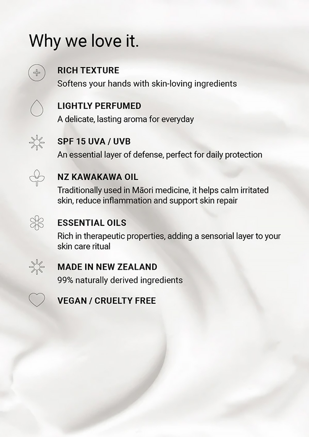 外出時,請隨身攜帶您的護手霜,以便隨時照顧雙手。本產品蘊含SPF15防曬成分,可全年保護雙手免受陽光傷害,並添加紐西蘭特有的卡瓦卡瓦油、富含維生素的酪梨油、椰子油和多種精油。