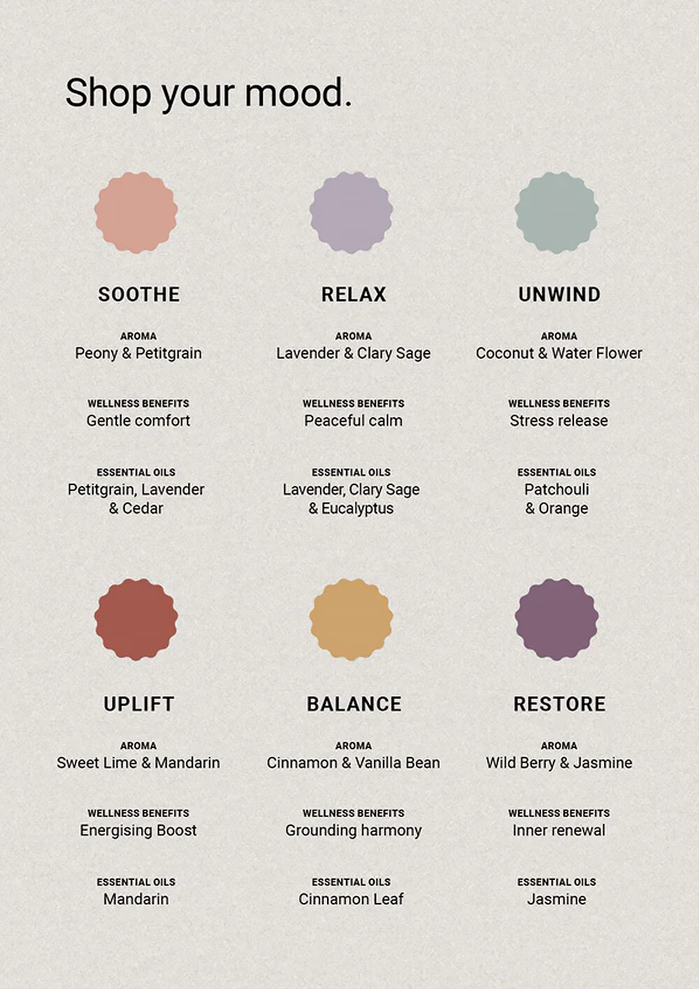 選擇適合您心情的香氛,提振精神、放鬆身心、平衡情緒、舒緩壓力、恢復活力、擁抱美好或徹底放鬆。
