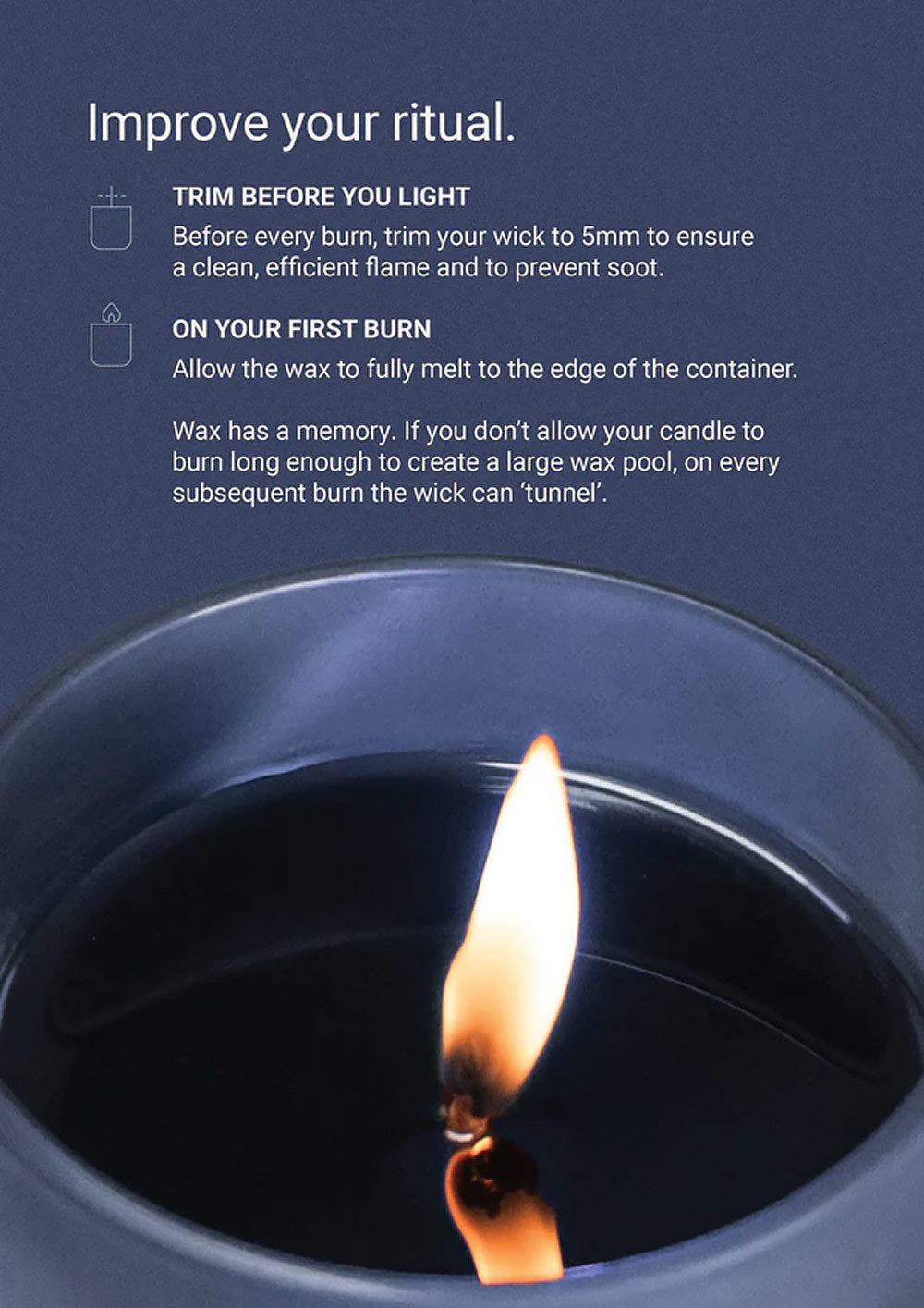 為了充分發揮蠟燭的功效,每次使用前,請將燭芯修剪至5毫米,以確保火焰清潔高效,並防止黑煙產生。