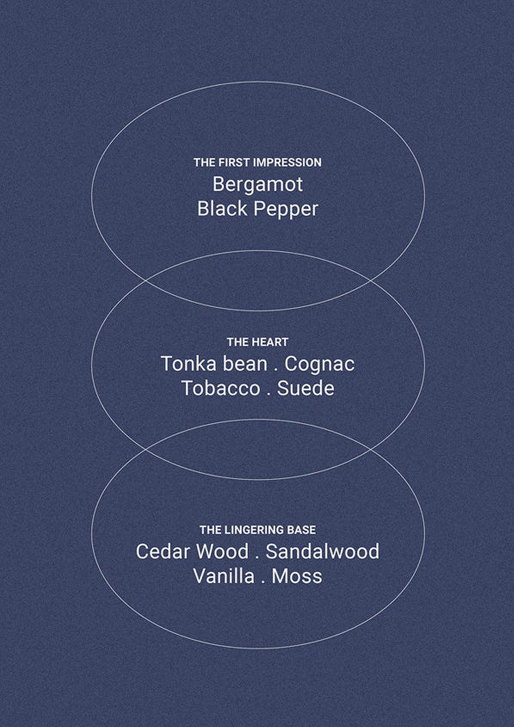 前調: 佛手柑、胡椒;中調: 零陵香豆、干邑、煙草、絨面革;後調: 雪松、檀香、香草、苔蘚